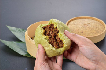 マリモをイメージした緑色の皮の中には阿寒産エゾシカ肉を100%使用。トマトソースで煮込まれたシカ肉の旨味がたっぷり詰まった肉まんです。そうして、出来上がったのが釧路町の食肉工房よしやすさんの協力により完成したまりもまんです。阿寒産のエゾシカ肉を100%使用している阿寒湖ならではのお土産肉まんです。